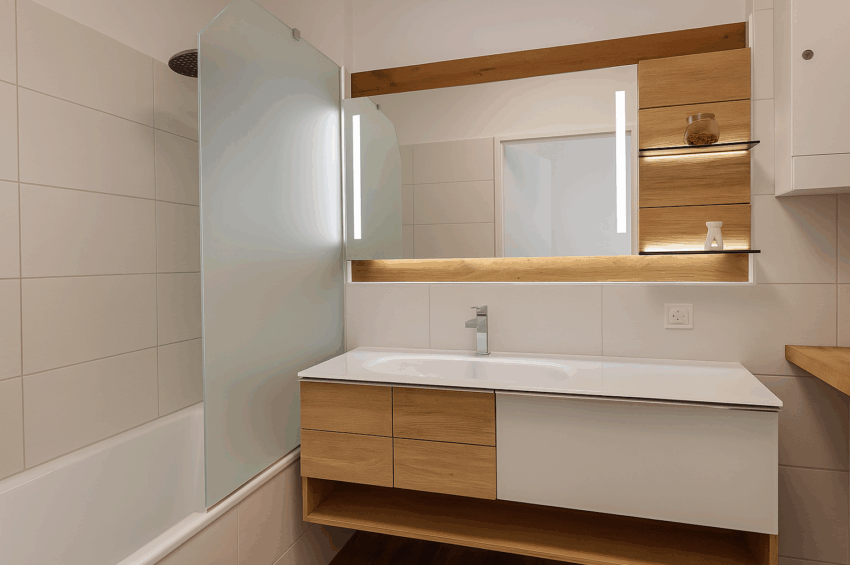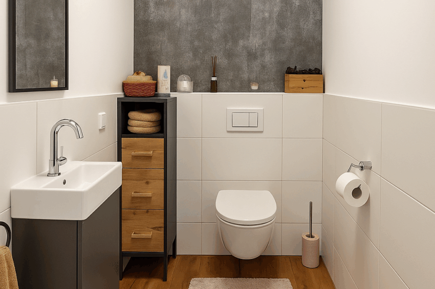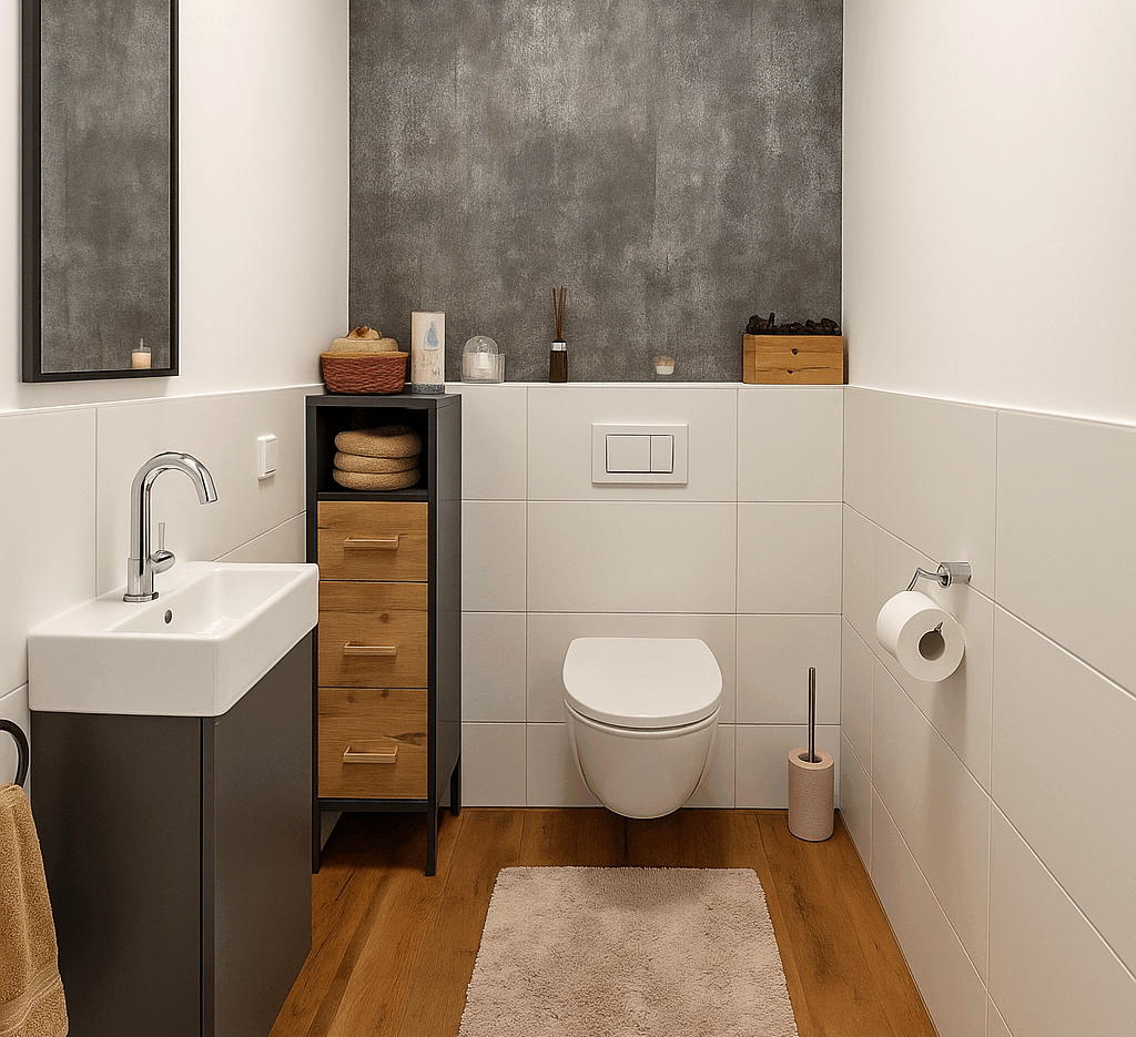 Das Badezimmer ist mit einer Badewanne, Waschbecken und Waschmaschinenanschluss ausgestattet. Ein zusätzlicher Abstellraum am Flur bietet praktischen Stauraum.