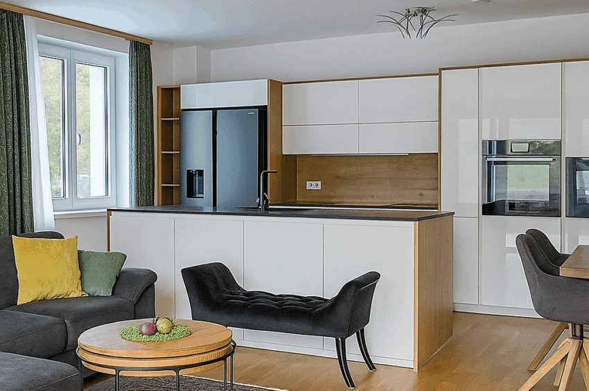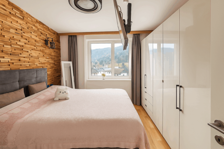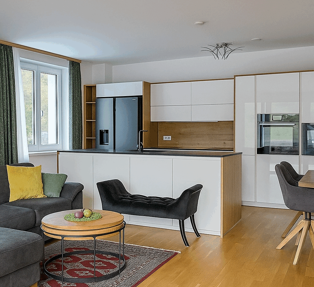 Das Wohnzimmer bildet das Herzstück der Wohnung – hell, offen und mit direktem Zugang zur großzügigen Terrasse. Hier befindet sich eine hochwertige DAN-Küche mit Kücheninsel inklusive aller Geräte und einer integrierten Kaffeemaschine, die keine Wünsche offenlässt. Die Westterrasse bietet nicht nur Sonne bis in die Abendstunden, sondern auch einen beeindruckenden Blick auf die umliegende Berglandschaft. Die laufende Wohnbauförderung kann übernommen werden.